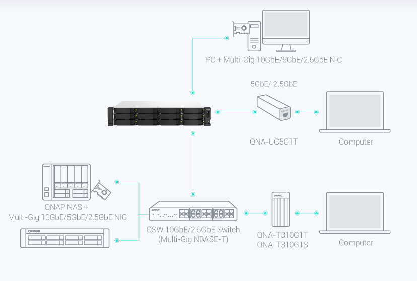 Model TS-1264U-RP idealnie współdziała z zarządzanymi i niezarządzanymi przełącznikami 2,5GbE/10GbE firmy QNAP w celu uzyskania wysokiej szybkości, bezpiecznego środowiska sieciowego z możliwością rozbudowy, nie przekraczając budżetu. QNAP oferuje również karty PCIe 2,5GbE/5GbE/10GbE oraz adaptery USB 5GbE dla stacji roboczych z systemem Windows/Linux, dzięki czemu można łatwo zbudować środowisko szybkiej sieci na potrzeby produktywnej współpracy zespołowej.