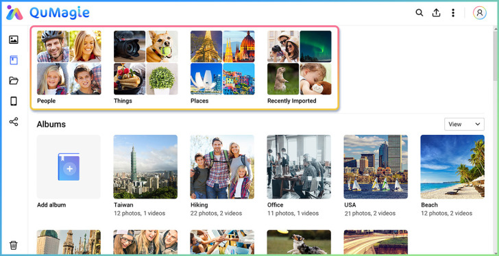 Aplikacja QuMagie wykorzystuje technologię rozpoznawania obrazów QuMagie Core AI do rozpoznawania twarzy, identyfikacji obiektów i geotagowania zdjęć. Podobne zdjęcia trafiają do albumów Osoby, Miejsca i Rzeczy. Ponadto aplikacja QuMagie oferuje wbudowaną oś czasu, konfigurowalne okładki folderów, pokazy slajdów iOS Live Photos i zaawansowane wyszukiwanie, udostępniając kompletne rozwiązanie do zarządzania zdjęciami i udostępniania.