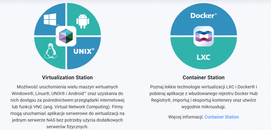 Aplikacje Virtualization Station i Container Station zapewniają kompleksową obsługę wirtualizacji. W połączeniu z aplikacją Sieć i przełącznik wirtualny, system usprawnia interoperacyjność maszyn wirtualnych, kontenerów, serwera QNAP NAS i innych urządzeń fizycznych w sieci, umożliwiając użytkownikowi elastyczne przydzielanie zasobów fizycznych i wirtualnych zasobów sieci, upraszczając wdrażanie sieci.