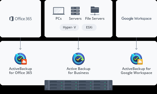 Pakiet Active Backup Suite umożliwia bezpieczne tworzenie kopii zapasowych serwerów i klientów Windows, kont Microsoft 365 i Google Workspace, serwerów plików oraz maszyn wirtualnych VMware i Hyper-V.