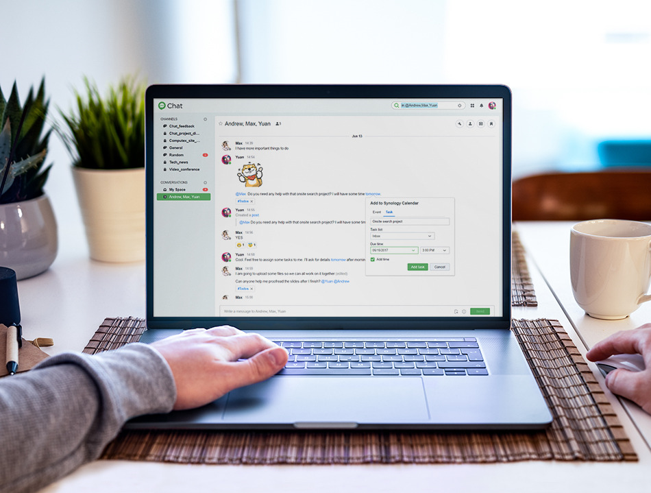 - Oprogramowanie Synology Office, Calendar i Chat zaspokoją wszystkie potrzeby związane ze współpracą zespołową, a wszystko to w bezpiecznej, prywatnej chmurze.