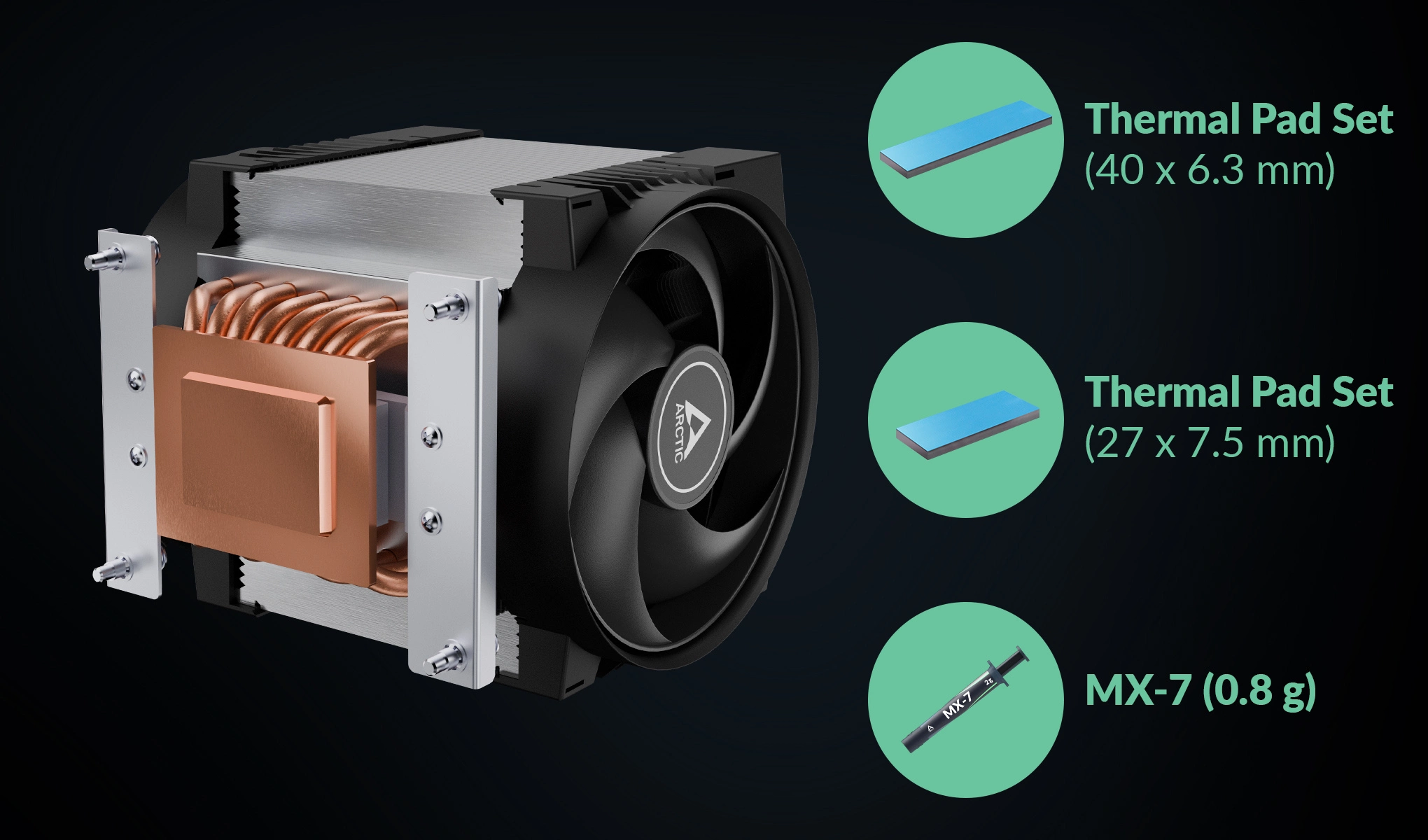 - Interfejs termiczny: MX-7 i pady – w zestawie znajduje się wysokiej klasy pasta termoprzewodząca oraz dedykowane podkładki termiczne.