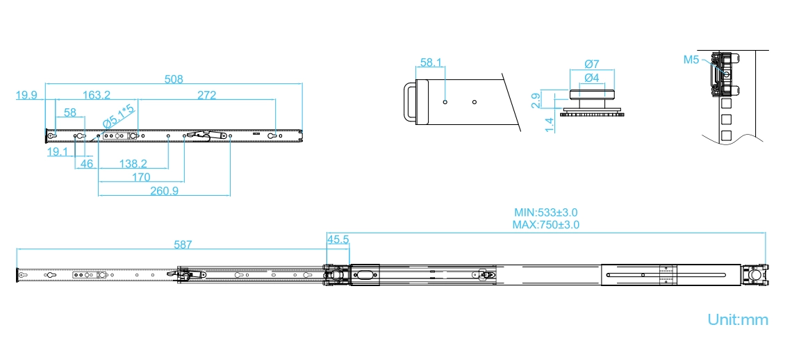 - Rozstaw montażowy: 533 mm do 750 mm – Elastyczność dopasowania do różnych głębokości szaf rackowych.