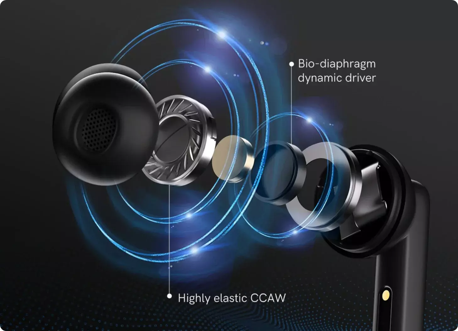 - Przetworniki 10 mm z bio-membraną: Wyjątkowa dynamika dźwięku – głębokie niskie tony i czyste, wysokie brzmienia.