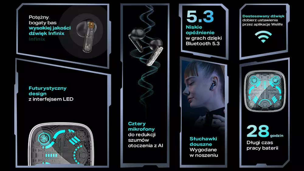 - Aplikacja: Welife - umożliwia pełną personalizację ustawień dźwięku i sterowania gestami dłoni.