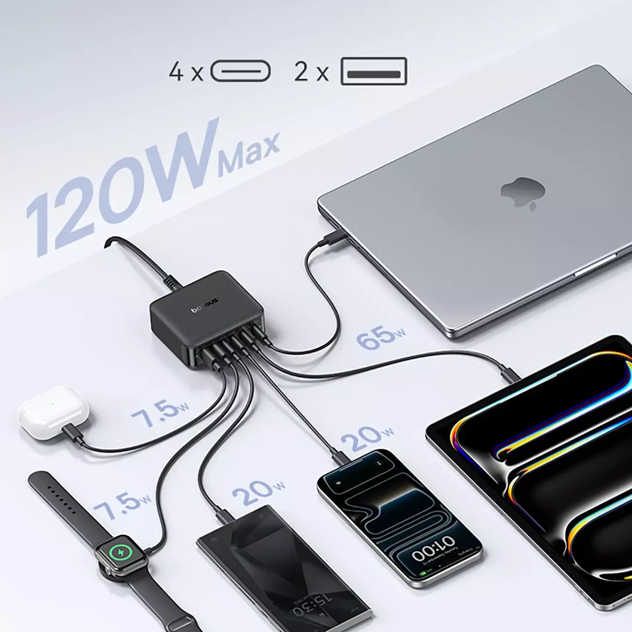 Stacja ładująca Baseus EnerFill FH21 120W 4xUSB-C + 2xUSB-A - czarna