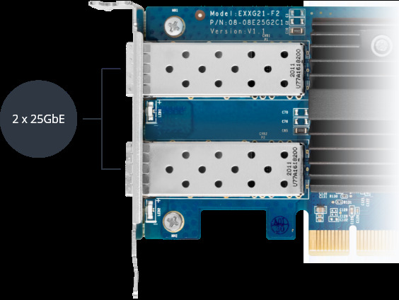 Synology E25G21-F2 to dwuportowa karta sieciowa 25 GbE SFP28, która umożliwia zwiększenie przepustowości i wydajności sieci. Większy ruch danych w celu obsługi wysokiej liczby użytkowników i najbardziej wymagających zadań.