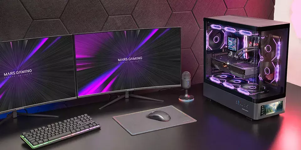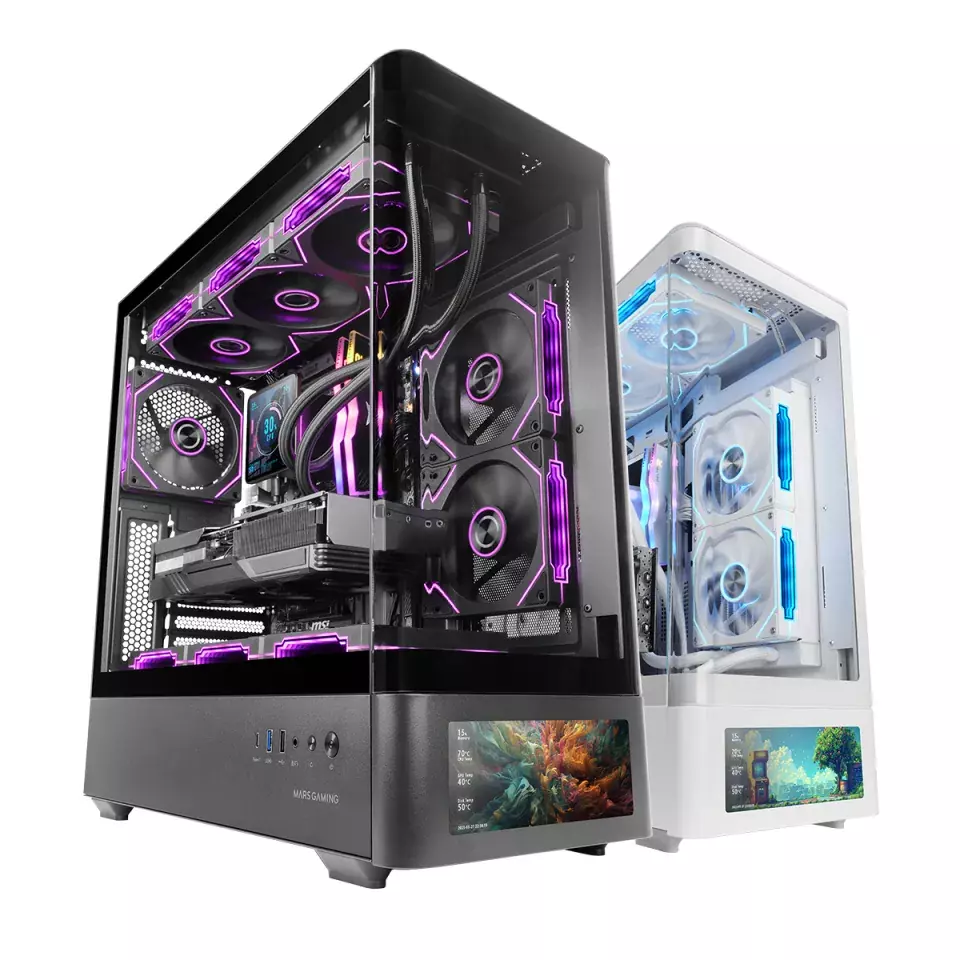 - Panele szklane: Zakrzywione hartowane szkło - bezramkowa konstrukcja zapewniająca panoramiczny widok na podzespoły z dwóch stron.