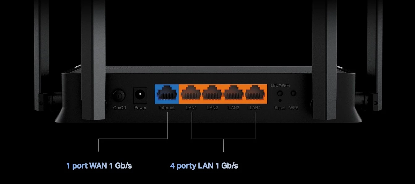 Ethernet: 1 port WAN 1 Gb/s, 4 porty LAN 1 Gb/s