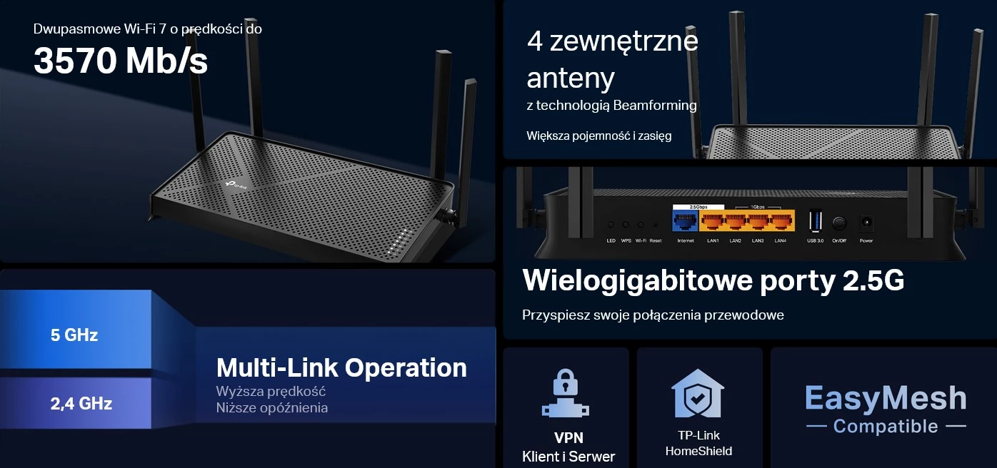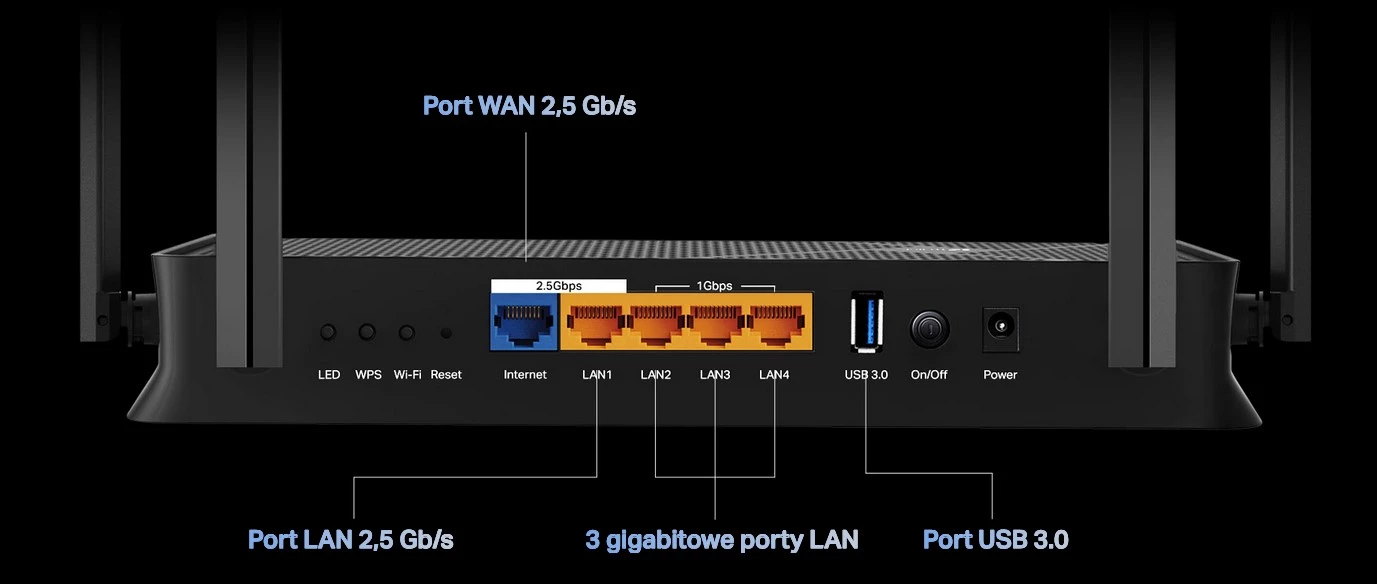 - Porty przewodowe: 2,5 Gb/s WAN/LAN – ultra-szybka łączność dla wymagających urządzeń kablowych