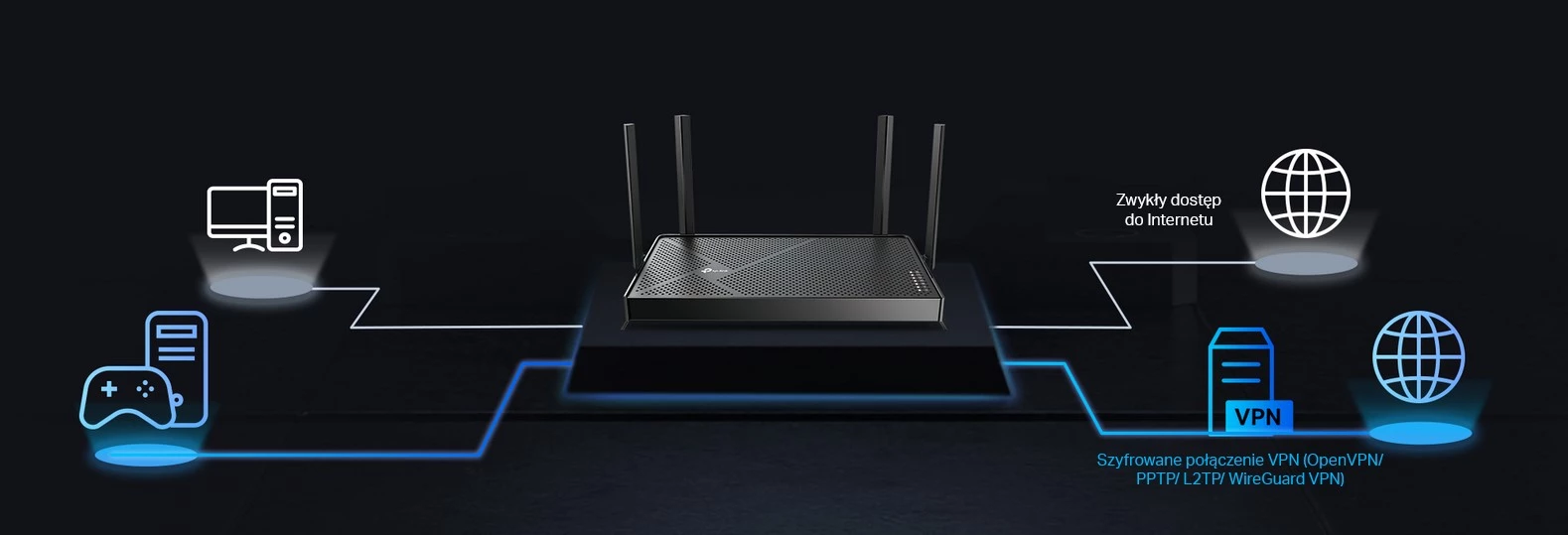 | Funkcje | MLO, 4K-QAM, Multi-RU, EasyMesh, HomeShield, Serwer i Klient VPN, Kontrola rodzicielska, QoS | ||