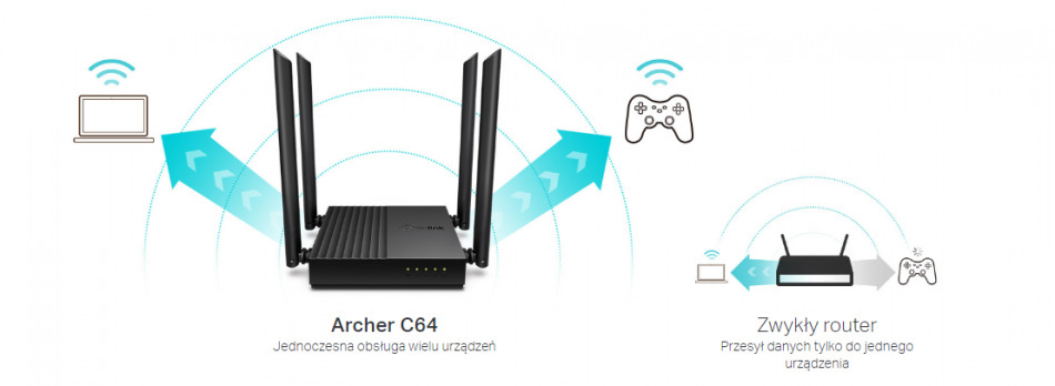 Dzięki technologii MU-MIMO‡ Archer C64 zwiększa efektywność oferowanych połączeń, pomagając urządzeniom osiągnąć optymalną wydajność działania. Urządzenia zawsze przesyłają i odbierają dane na mniej obciążonym w danym momencie paśmie. Nielimitowana rozrywka bez opóźnień na wszystkich urządzeniach staje się rzeczywistością.
