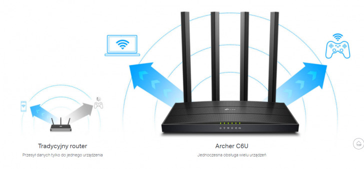 - Technologia MU-MIMO umożliwia łączenie się z dwoma urządzeniami jednocześnie, co sprawia, że wydajność routera wzrasta dwukrotnie.