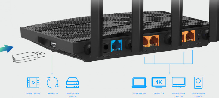 Gigabitowe porty Ethernet zapewniają maksymalne prędkości przewodowe. Podłącz komputer, smart TV czy konsolę do gier i korzystaj z niezawodnych połączeń. Port USB 2 to duże ułatwienie w kwestii udostępniania plików, zdjęć, fimów i wielu innych.To równocześnie punkt dostępowy