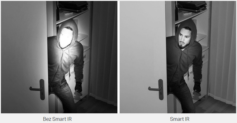 • Smart IR zapobiega niedoświetleniu oddalonych obiektów oraz prześwietleniu obiektów blisko obiektywu w trybie nocnym