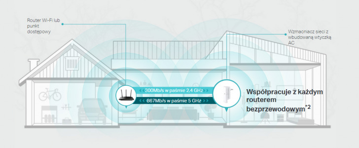 - Wzmacniacz współpracuje z każdym routerem Wi-Fi oraz bezprzewodowym punktem dostępowym