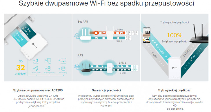 - Wzmacnia dwupasmową sieć bezprzewodową, eliminując martwe strefy Wi-Fi