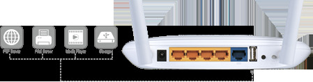 Konfiguracja portu USB 2.0 w routerze TL-WR842N użytkownikom udostępnianie danych umieszczonych na dysku USB lub serwerze FTP. Użytkownicy mogą również udostępniać muzykę, pliki wideo i zdjęcia poprzez wbudowany serwer multimediów. Ponadto wbudowany serwer druku pozwala na wygodne udostępnianie domowej lub biurowej drukarki