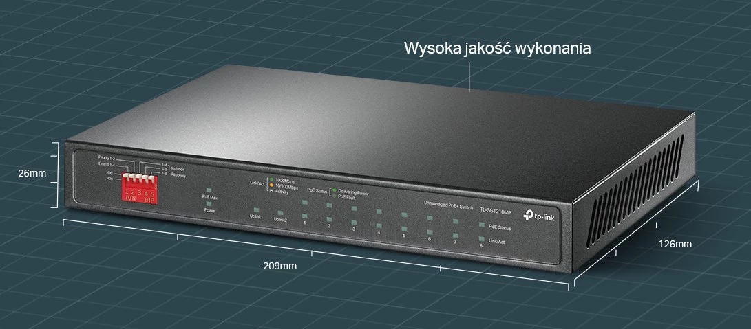 - Porty: 9 portów RJ45 10/100/1000 Mb/s oraz 1 port combo SFP/RJ45 zapewniające elastyczność połączeń.