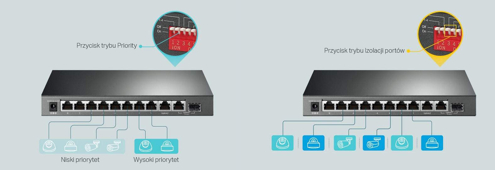 - Zarządzanie ruchem: tryby Priority oraz Isolation optymalizujące pracę kamer i zwiększające bezpieczeństwo sieci.