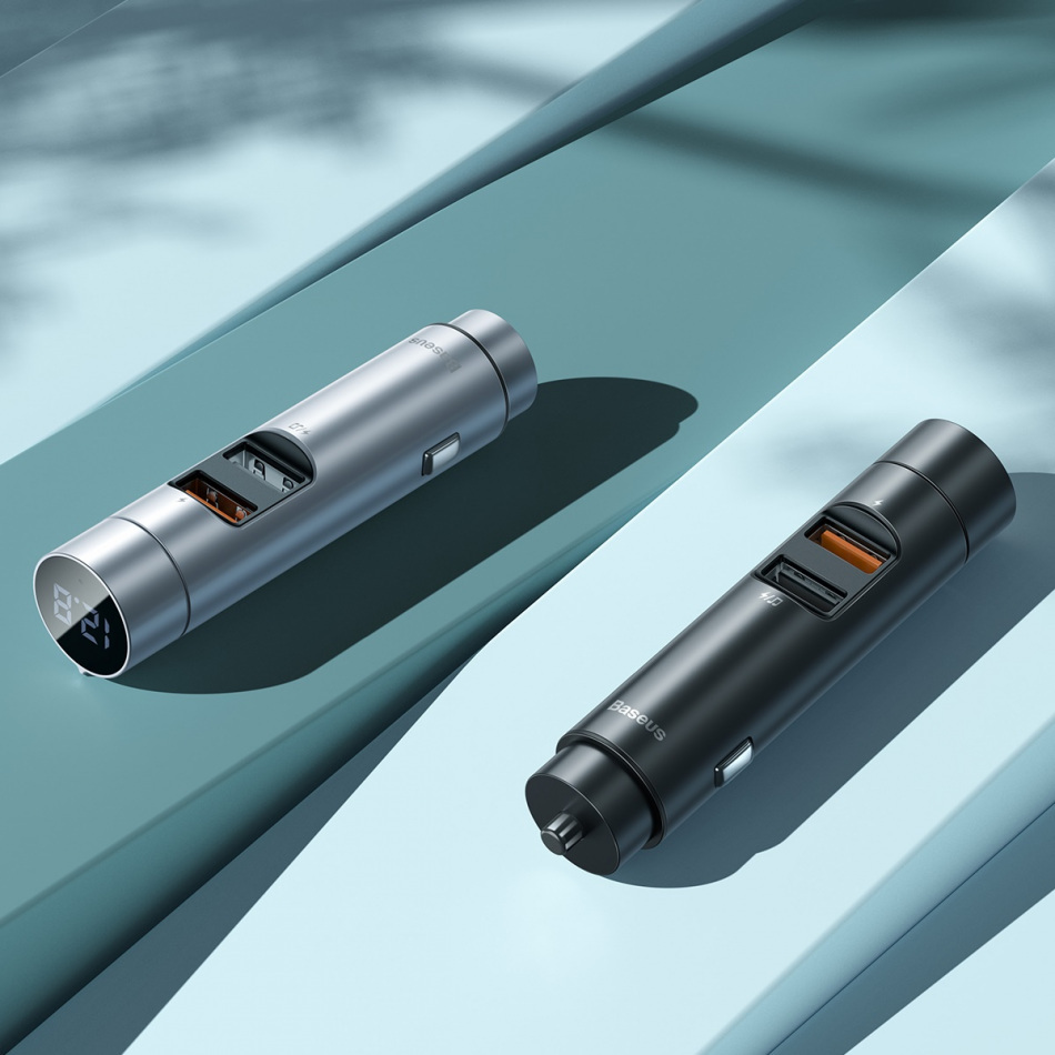 Ładowarka samochodowa marki Baseus z funkcją transmitera FM. To jest wielofunkcyjne urządzenie, które poprawi komfort jazdy samochodem. Dzięki niej naładujesz jednocześnie dwa telefony i przestaniesz martwić się rozładowaną baterią. Ta ładowarka ma też wbudowany transmiter FM, za pomocą którego łatwo odtworzysz muzykę z telefonu na radiu samochodowym. Oprócz połączenia Bluetooth z telefonem, możesz też puszczać piosenki zapisane na pendrive. Jeden z dwóch portów USB pozwala na podłączenie zewnętrznej pamięci z utworami zapisanymi w formacie MP3, WAV, FLAC, APE lub WMA.
