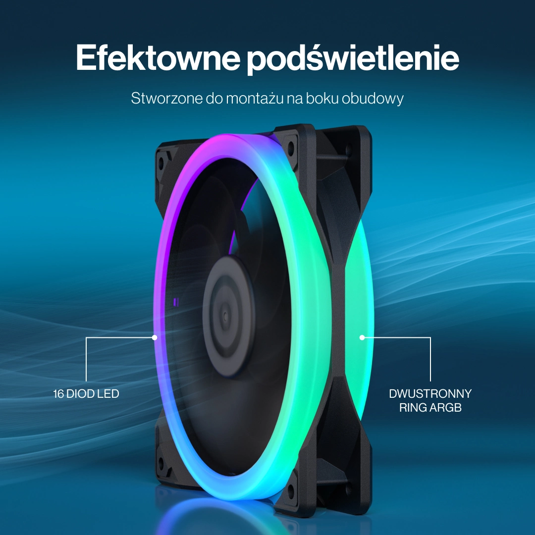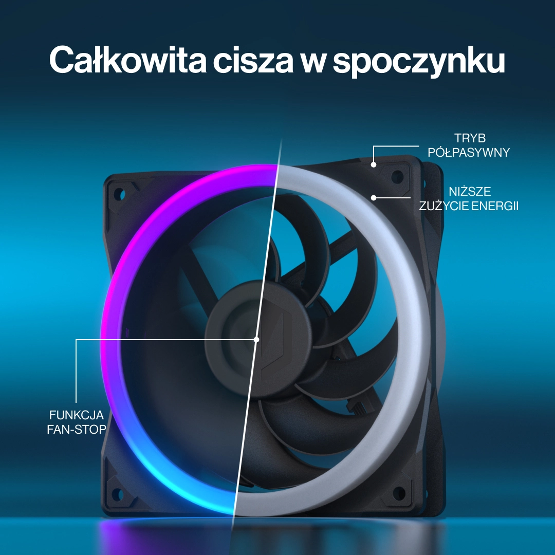 - Podświetlenie: Dwustronny pierścień ARGB – oferuje wielobarwne, płynne efekty świetlne widoczne niezależnie od kierunku montażu jednostki w obudowie.