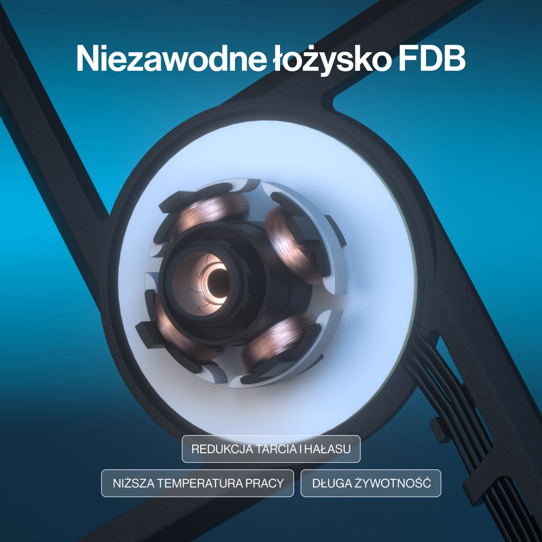 - Łożysko: FDB (Fluid Dynamic Bearing) – nowoczesna konstrukcja ograniczająca tarcie, co przekłada się na wyjątkowo cichą pracę i długowieczność mechanizmu.