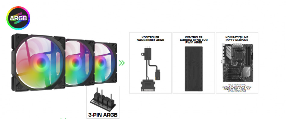 Adresowalne RGB czyli ARGB zapewnia możliwość indywidualnego dobrania koloru pojedynczego źródła światła. W efekcie, każdy z 9 LED-ów może emitować inny kolor. Daje to ogromne możliwości dobrania efektów podświetlenia, a wśród nich tęcza czy płynne przejścia.Wysokie ciśnienie statyczne