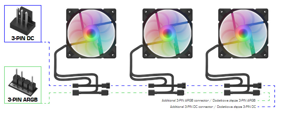 Regulacja prędkości obrotowej odbywa się poprzez funkcję DC (wtyczka 3-pinowa), co jest obsługiwane przez płyty główne oraz popularne kontrolery.