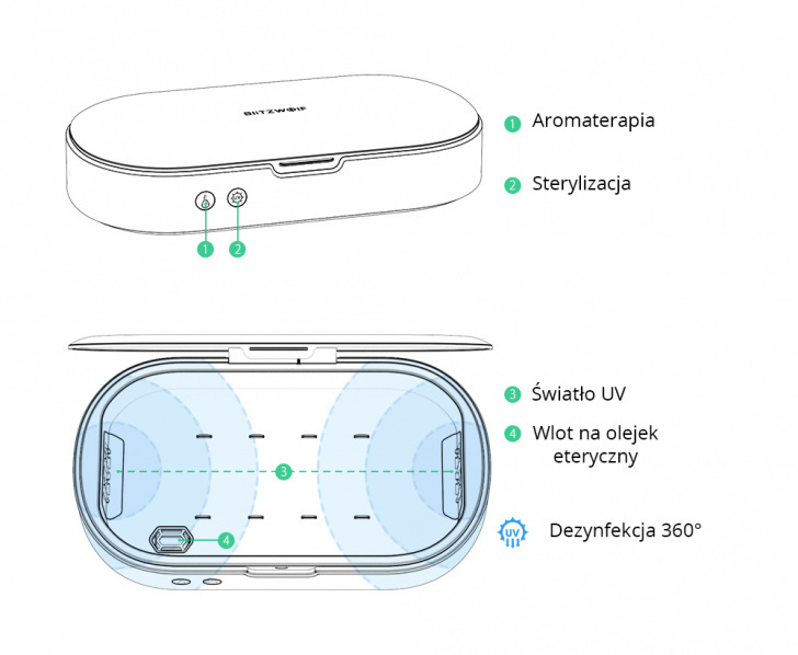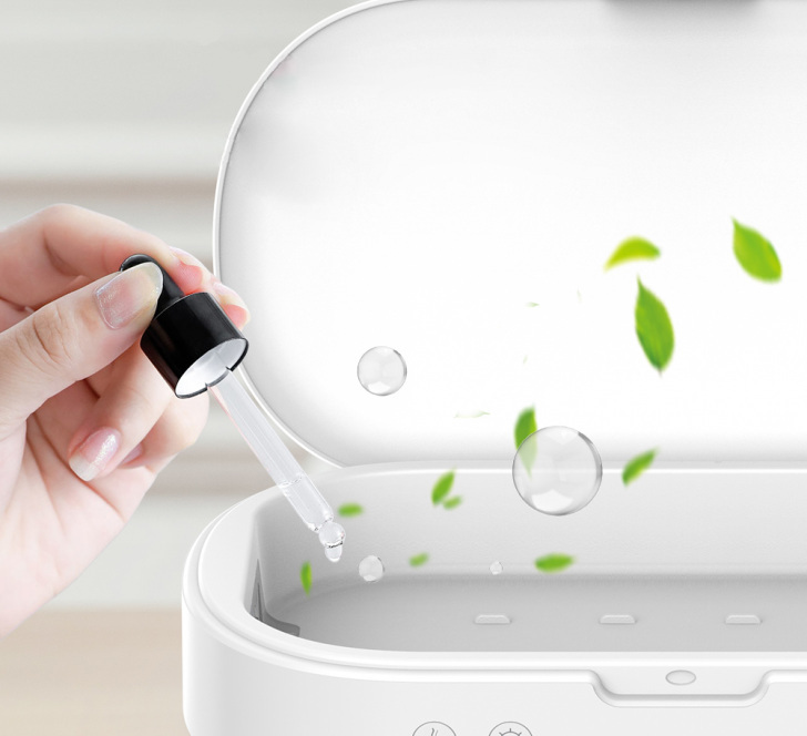Urządzenie obsługujemy za pomocą dwóch przycisków, jeden jest odpowiedzialny na sterylizację, drugi za aromaterapię. Wystarczy włożyć przedmioty do środka i kliknąć przycisk po 5 minutach automatycznie rozpocznie się proces sterylizacji/aromaterapii.