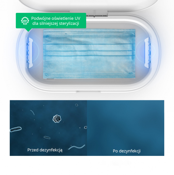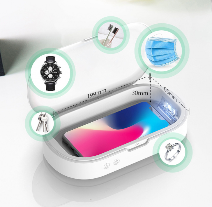 Zaprojektowane dla smartfonów o przekątnej 6,5" i innych małych obiektów. Możemy w nim wysterylizować na przykład telefon, klucze, maseczki, zegarek i wiele więcej.