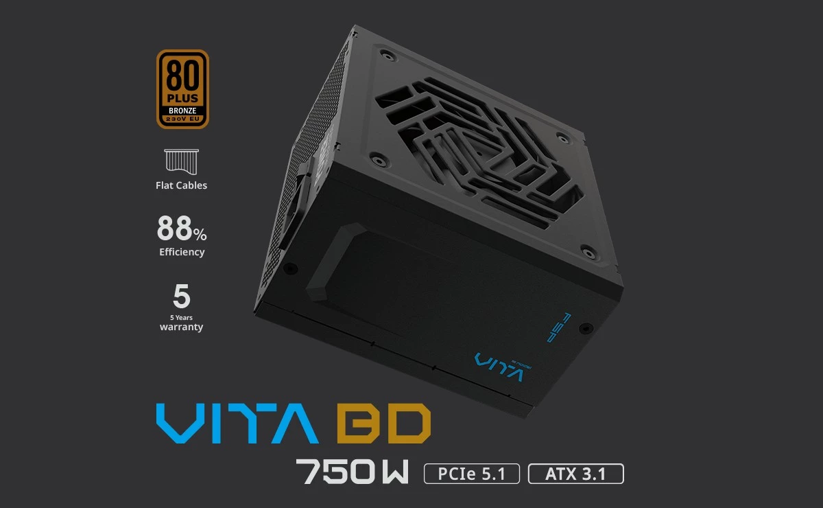 Dodaj pierwszą opinię: Zasilacz FSP Fortron VITA 750 BD Bulk 750W Bronze ATX 3.1 PCIe 5.1 czarny (VITA-750BD-B)Raty