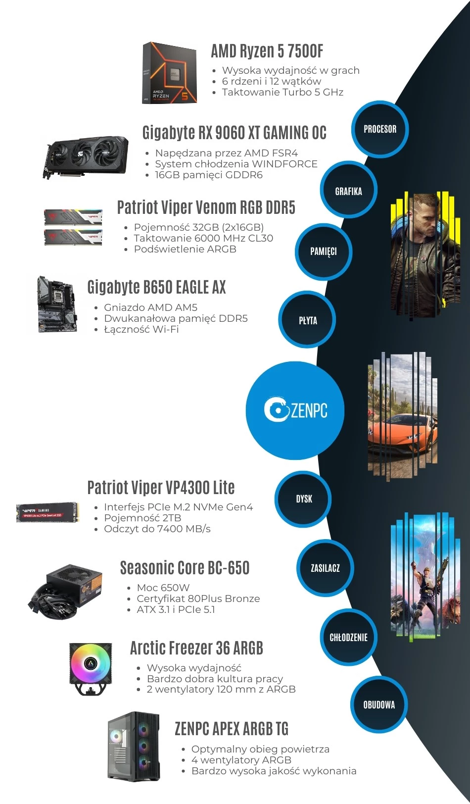 Dodaj pierwszą opinię: ZENPC Gaming AMD Ryzen 5 7500F 9060XT16GB 2TB 32GB APEXRaty