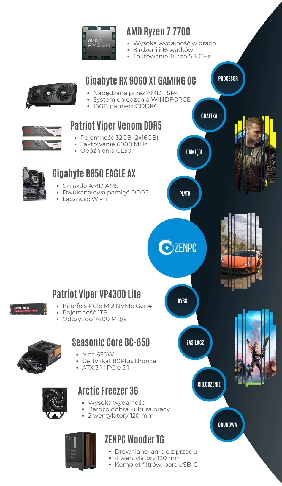 Dodaj pierwszą opinię: ZENPC Gaming AMD Ryzen 7 7700 9060XT16GB 1TB 32GB WooderRaty