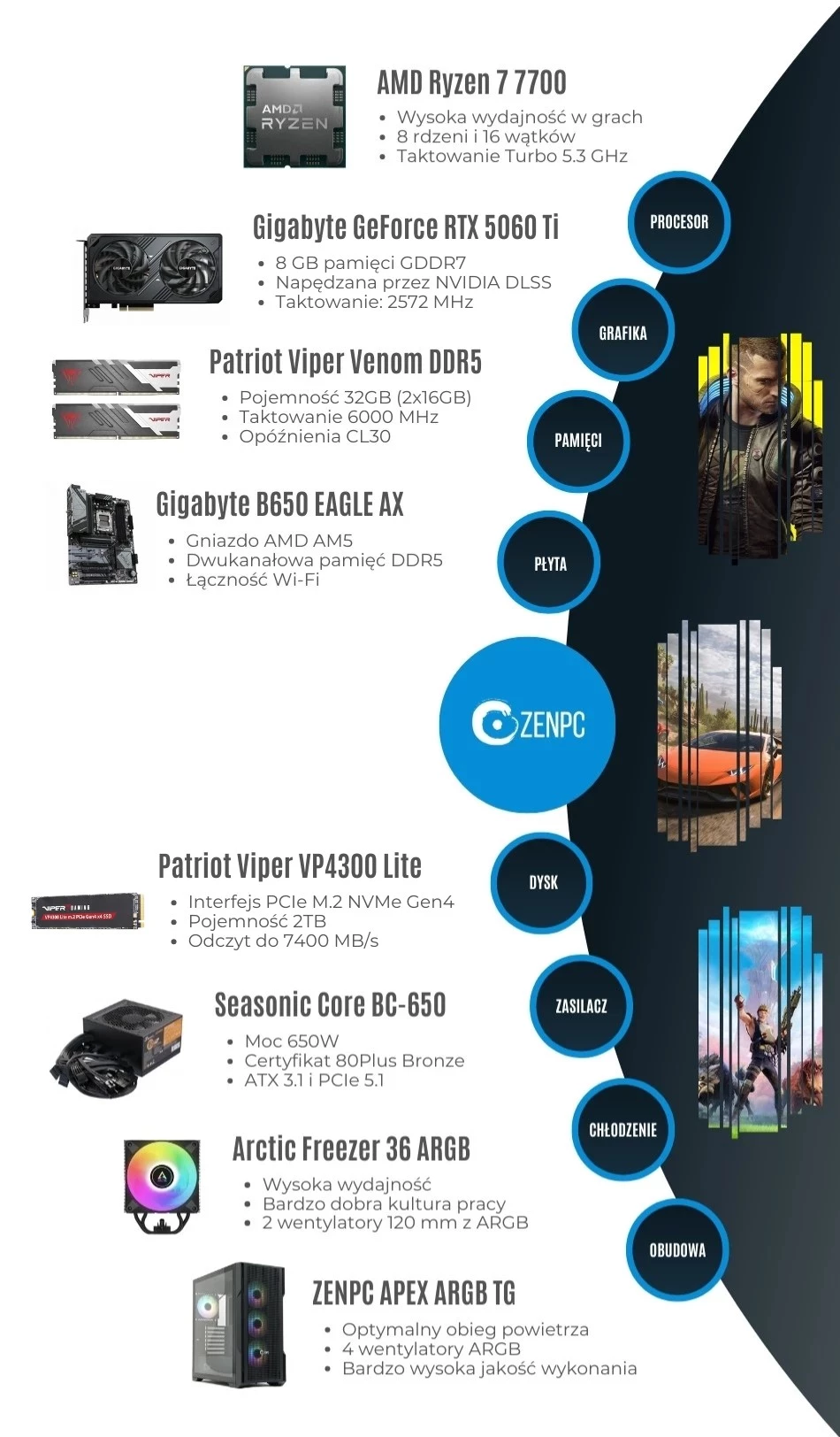 Dodaj pierwszą opinię: ZENPC Gaming AMD Ryzen 7 7700 RTX5060Ti 8GB 2TB 32GB DLSS 4Raty