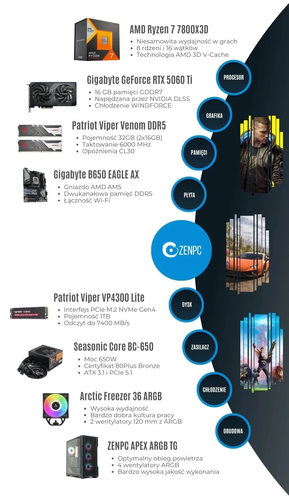 Komputer gamingowy ZENPC AMD Ryzen 7 7800X3D RTX 5060 Ti 16GB 1TB 32GB DLSS