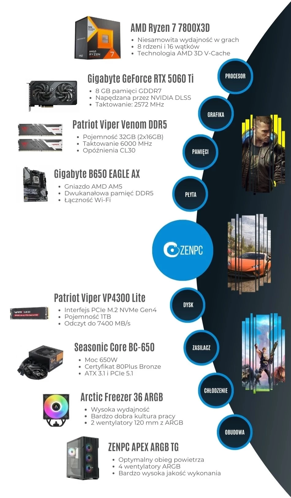 Dodaj pierwszą opinię: ZENPC Gaming AMD Ryzen 7 7800X3D RTX5060Ti 8GB 1TB 32GB DLSS 4Raty
