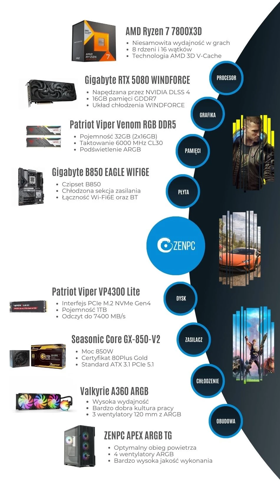 Dodaj pierwszą opinię: ZENPC Gaming AMD Ryzen 7 7800X3D RTX5080 1TB 32GB ARGB DLSS 4Raty