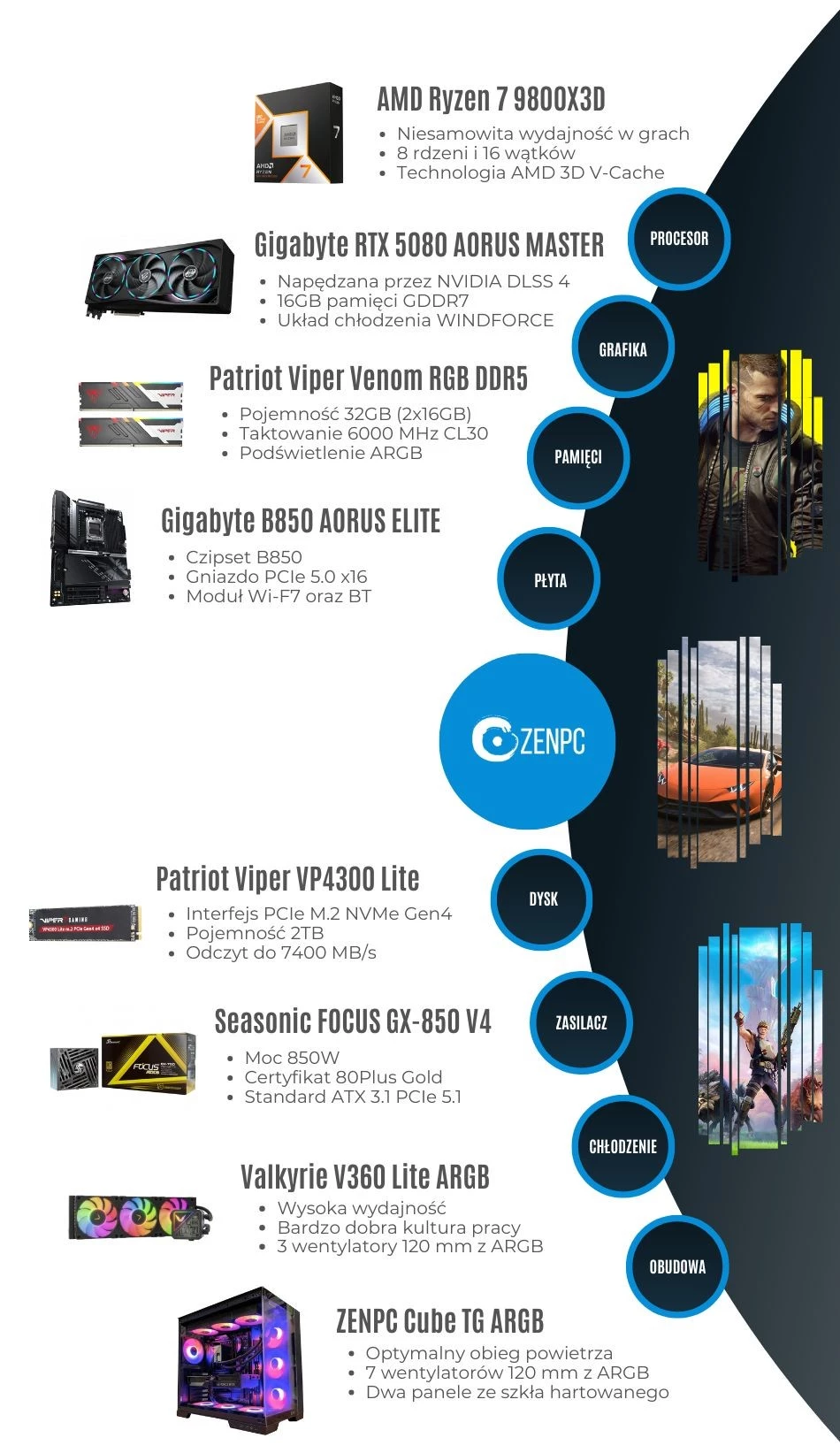 Dodaj pierwszą opinię: ZENPC Gaming AMD Ryzen 7 9800X3D RTX5080 MASTER 2TB 32GB ARGB DLSS 4Raty