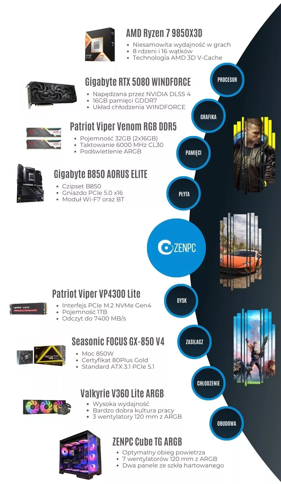 Dodaj pierwszą opinię: ZENPC Gaming AMD Ryzen 7 9850X3D RTX5080 1TB 32GB ARGB DLSS 4Raty