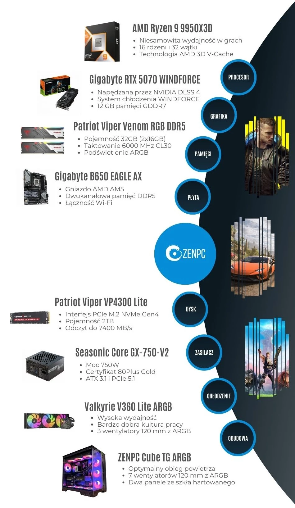 Komputer do gier ZENPC Gaming AMD Ryzen 9 9950X3D RTX 5070 2TB 32GB DLSS 4
