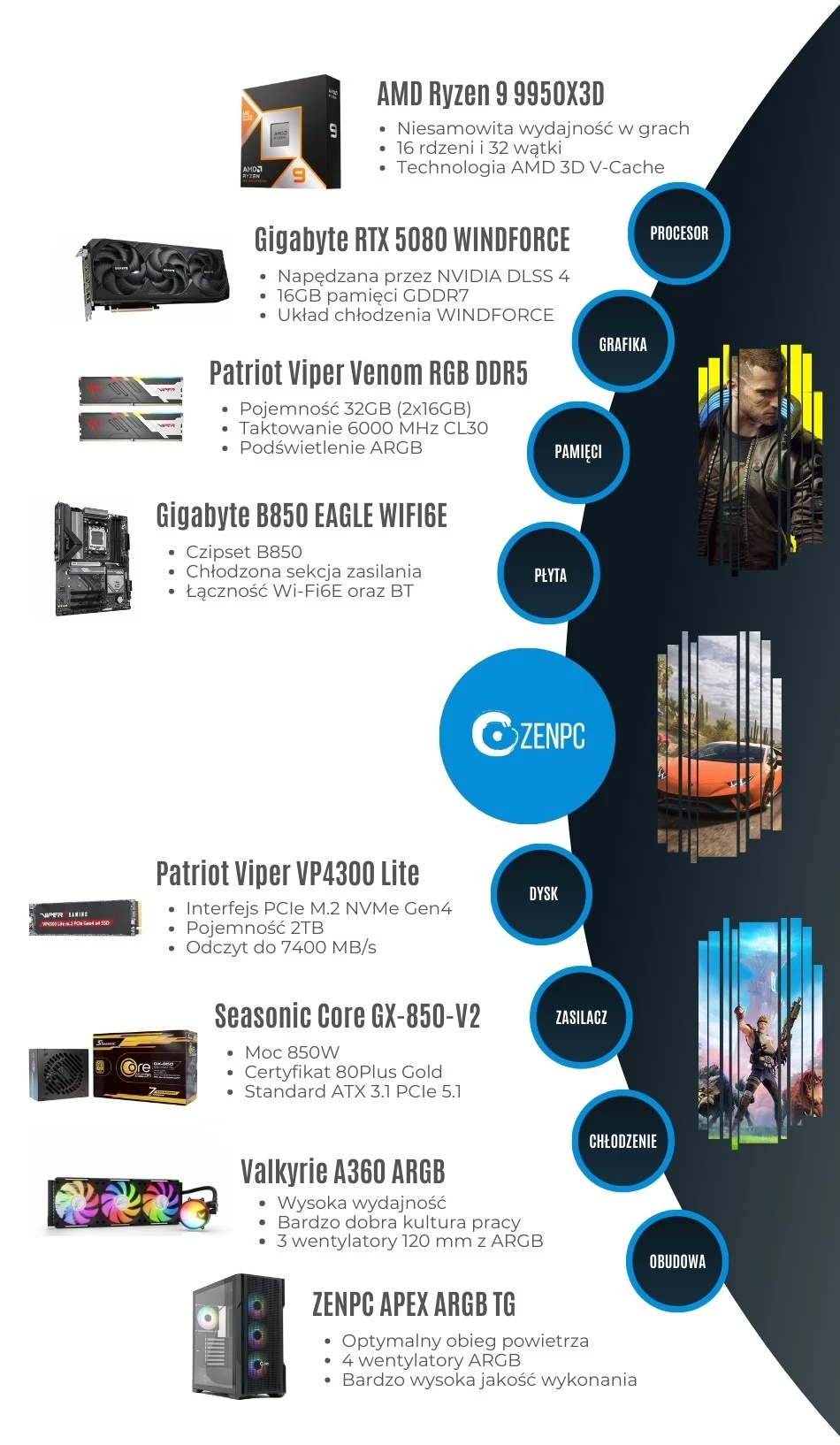 Dodaj pierwszą opinię: ZENPC Gaming AMD Ryzen 9 9950X3D RTX5080 2TB 32GB ARGB DLSS 4Raty