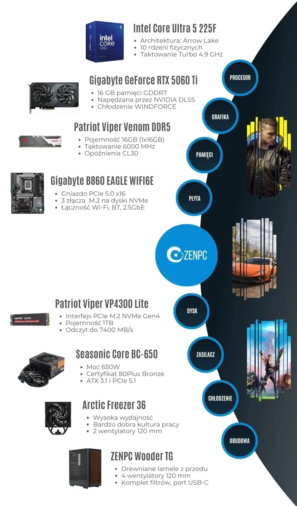 Komputer ZENPC Intel Ultra 5 225F RTX 5060 Ti 16GB 1TB 16GB DLSS 4