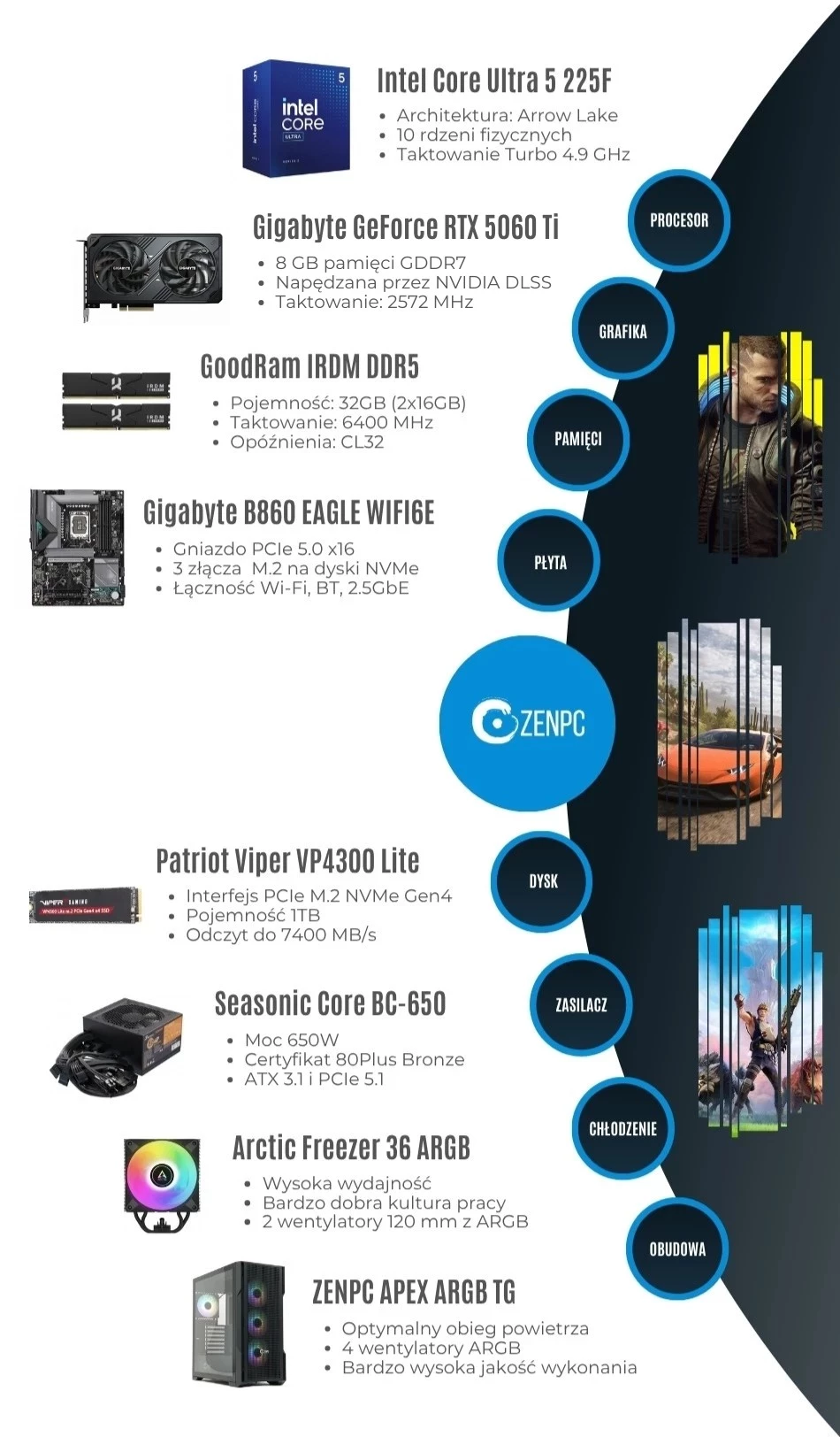 Komputer gamingowy ZENPC Intel Ultra 5 225F RTX 5060 Ti 8GB 1TB 32GB DLSS 4