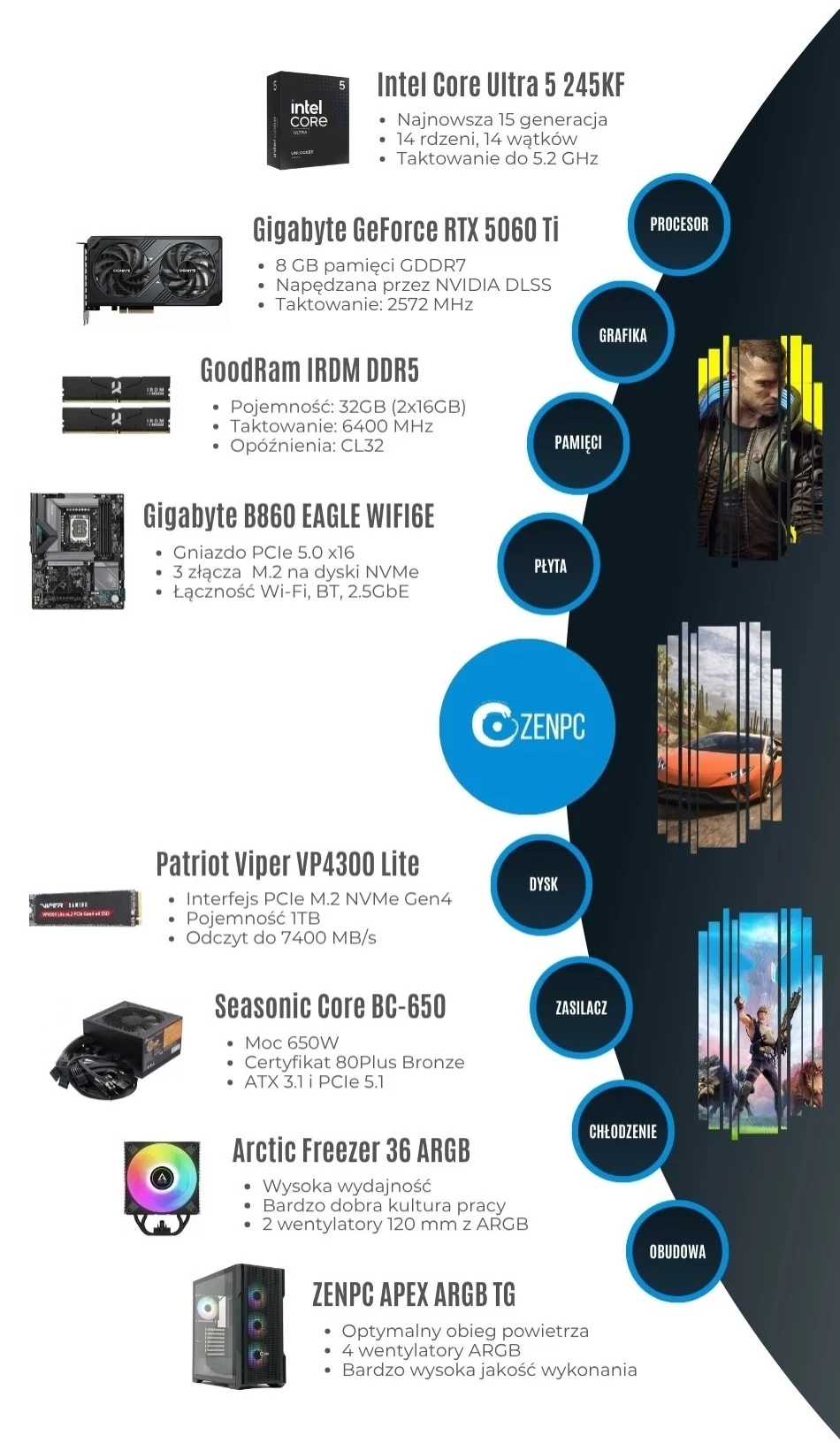 Komputer gamingowy ZENPC Intel Ultra 5 245KF RTX 5060 Ti 8GB 1TB 32GB DLSS4