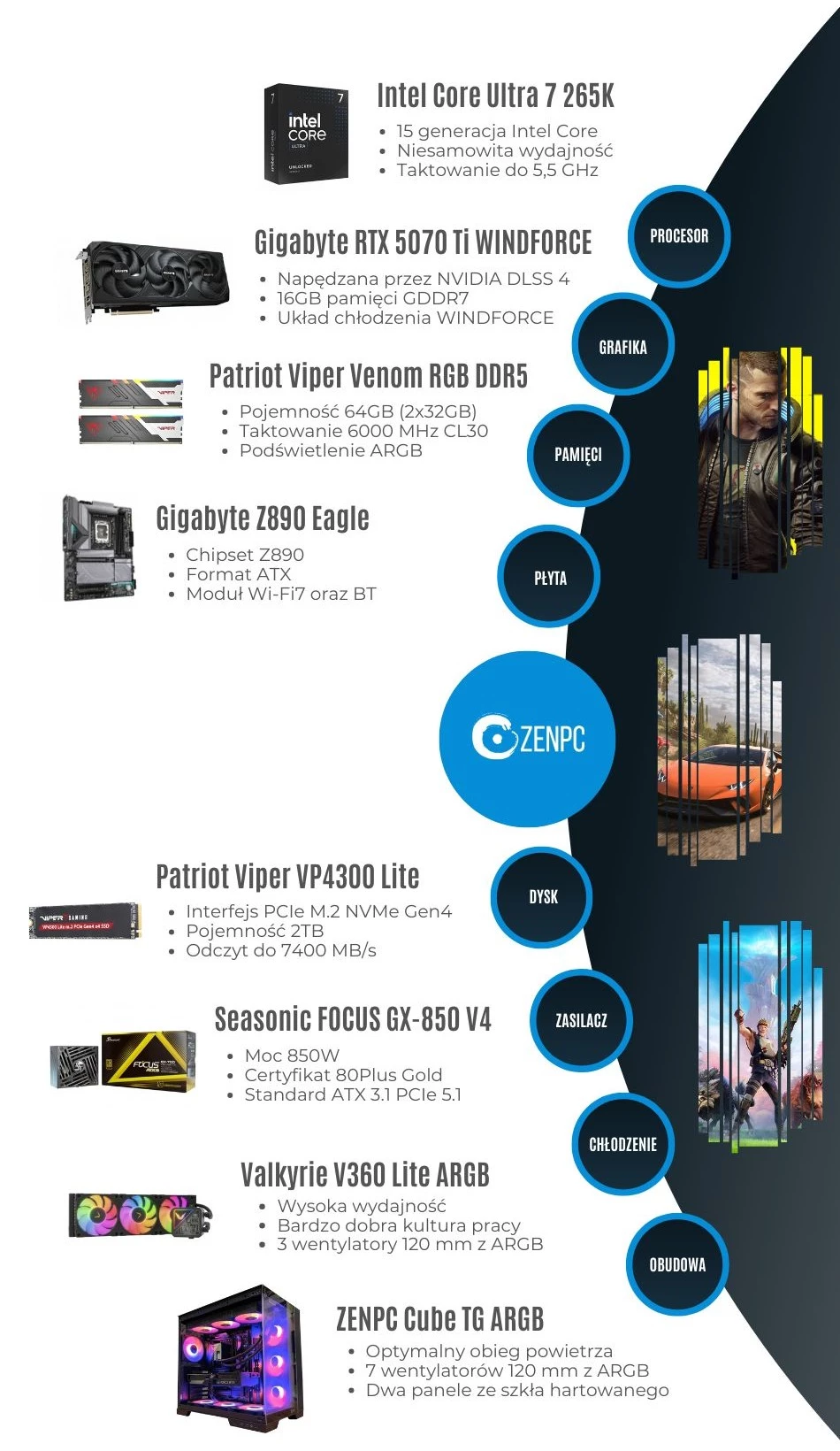 Dodaj pierwszą opinię: ZENPC Gaming Intel Ultra 7 265K RTX5070Ti 2TB 64GB ARGB DLSS 4Raty
