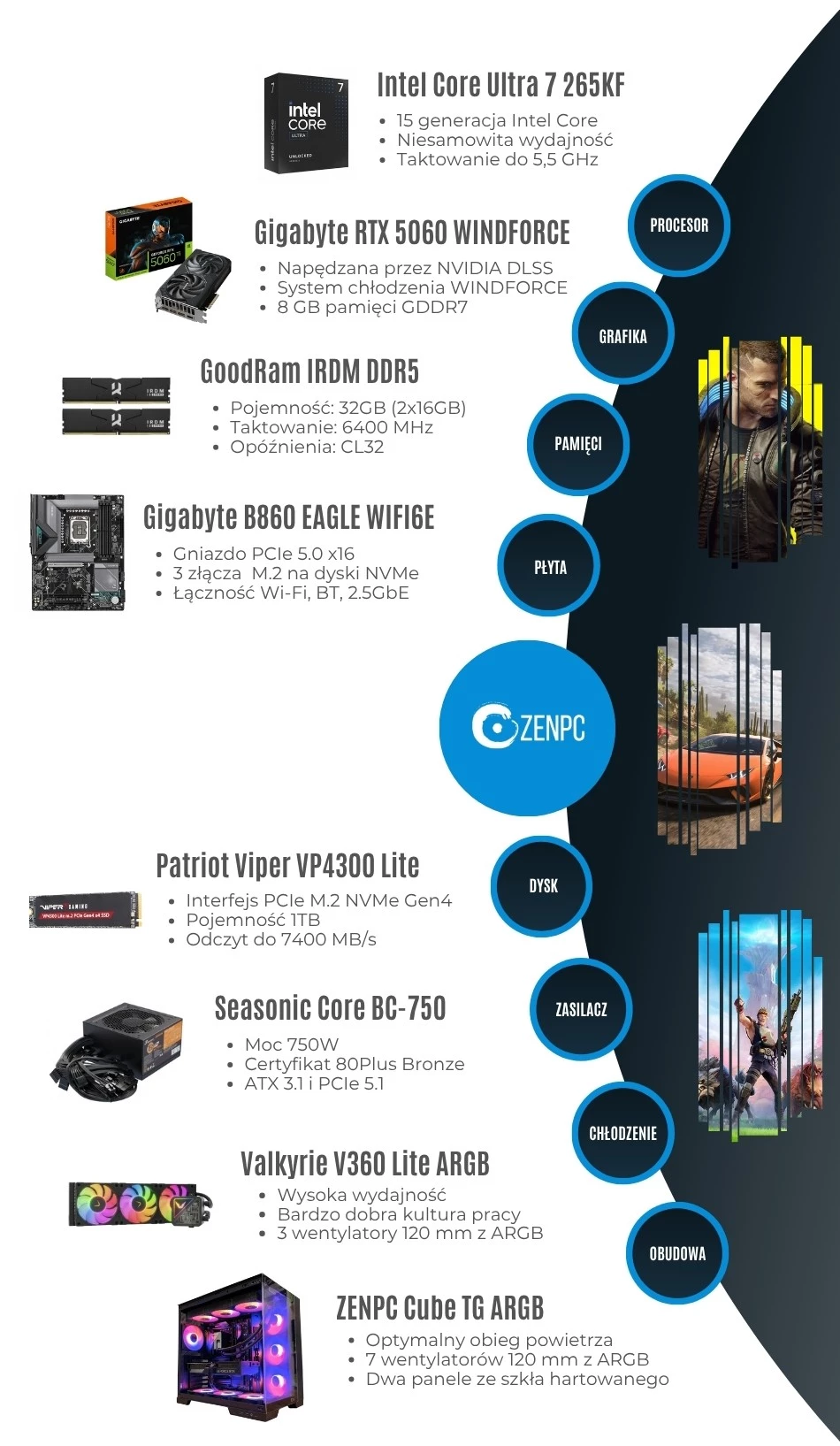 Komputer do gier ZENPC Intel Ultra 7 265KF RTX 5060 1TB 32GB DLSS 4