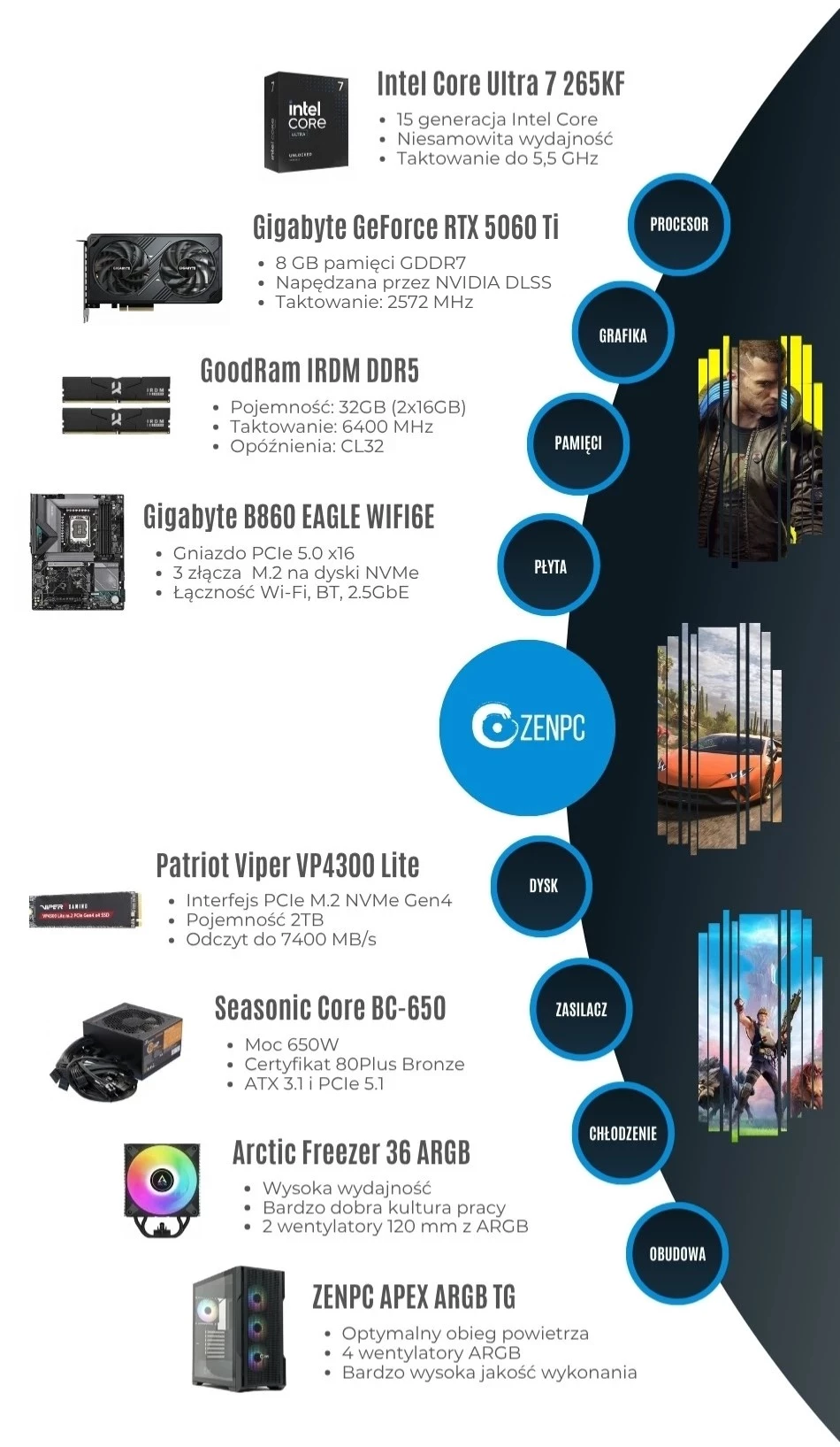 Komputer gamingowy ZENPC Intel Ultra 7 265KF RTX 5060 Ti 8GB 2TB 32GB DLSS4