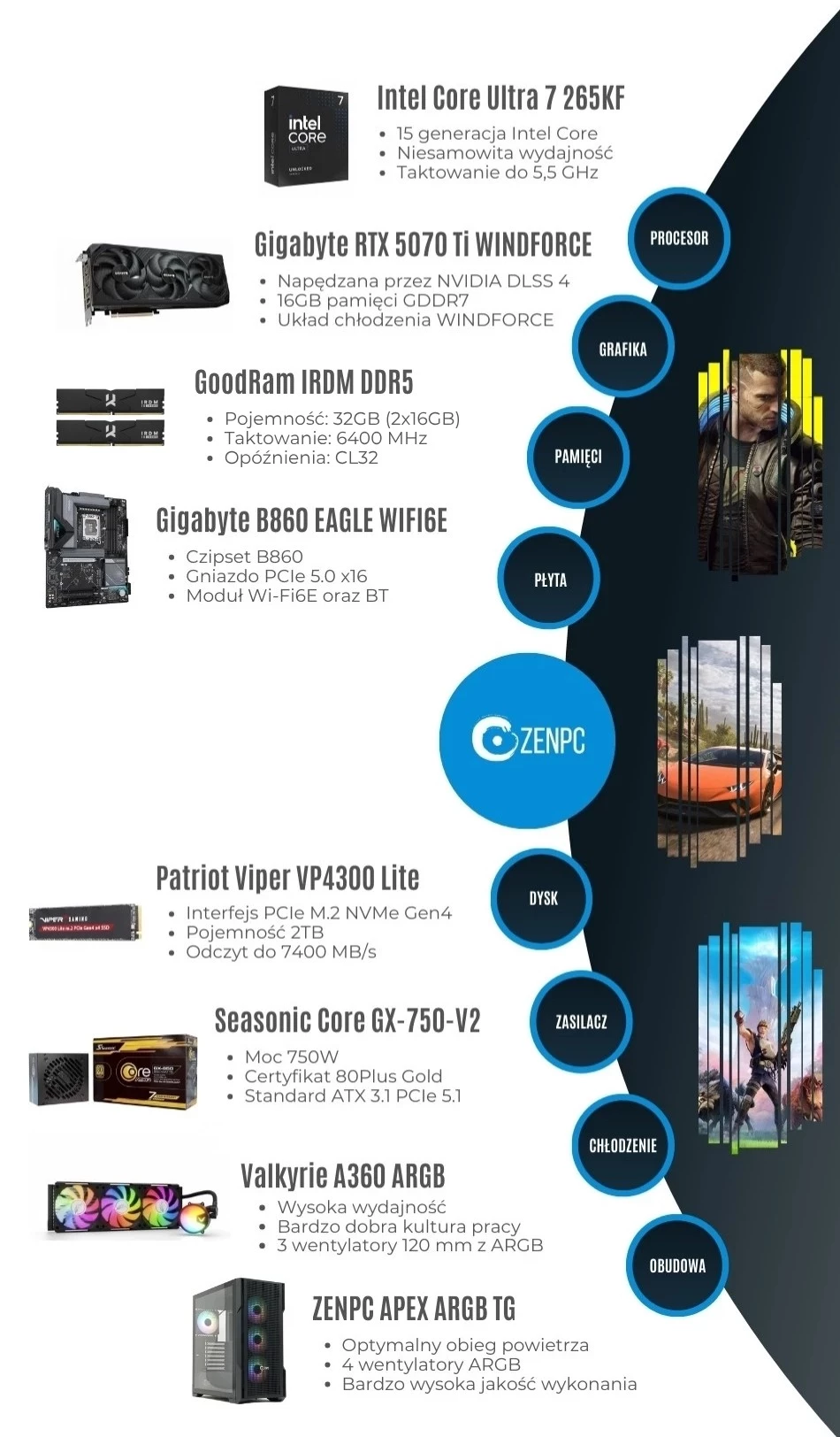 Komputer gamingowy ZENPC Intel Ultra 7 265KF RTX 5070Ti 2TB 32GB DLSS 4