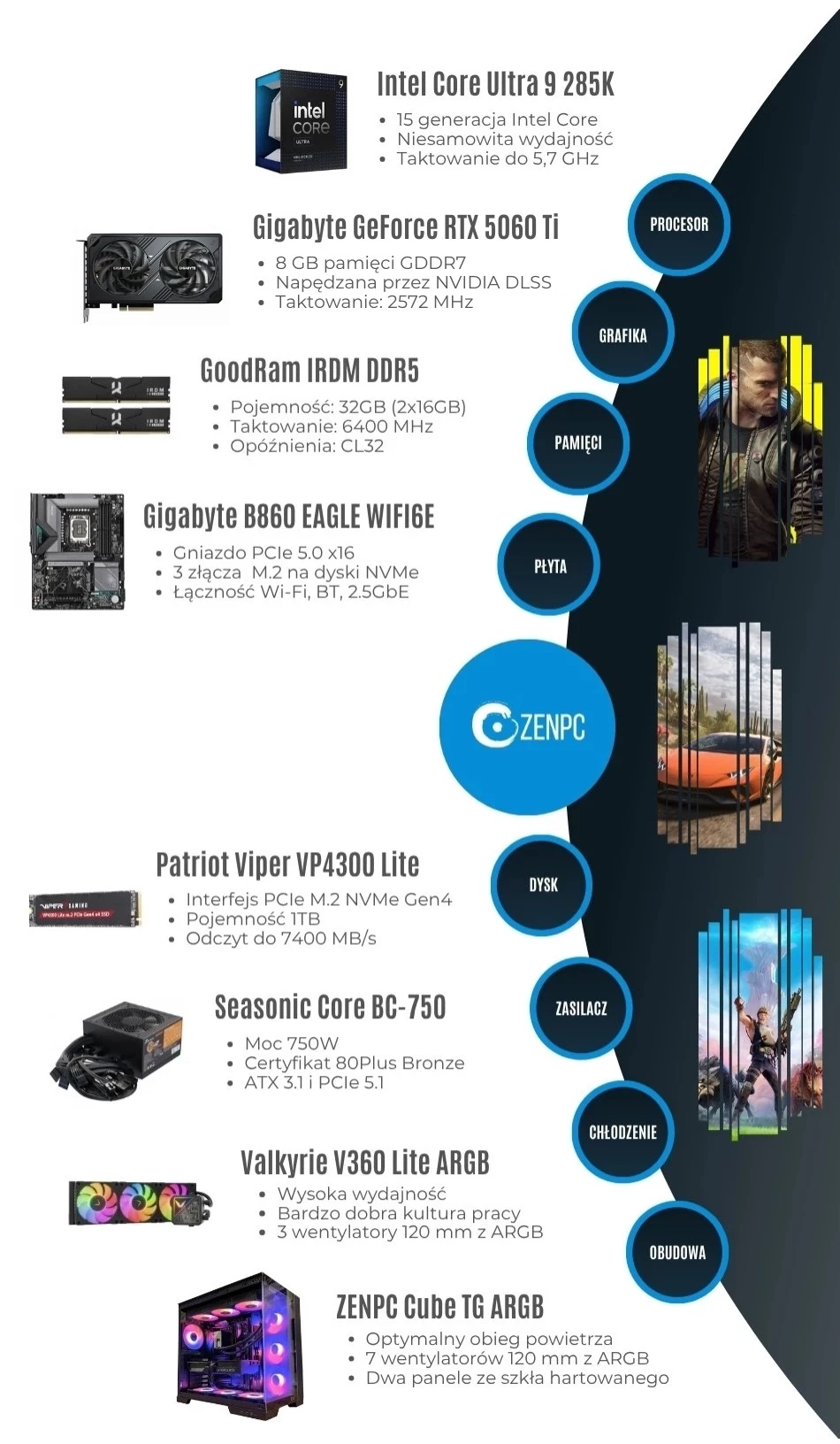 Komputer do gier ZENPC Intel Ultra 9 285K RTX 5060 Ti 8GB 1TB 32GB DLSS 4
